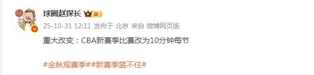媒体人球圈赵探长报道:“重大改变:CBA新赛季比赛改为10分钟每节。”